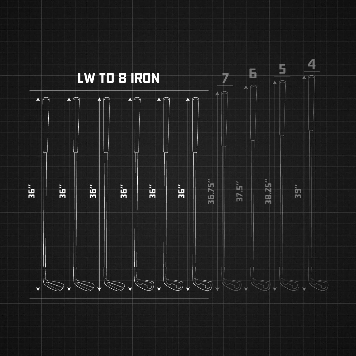 In our combo length sets, the Lob wedge to the 8 iron have a uniform shaft length, roughly equivalent to a 9 iron length. One setup position, greater consistency.