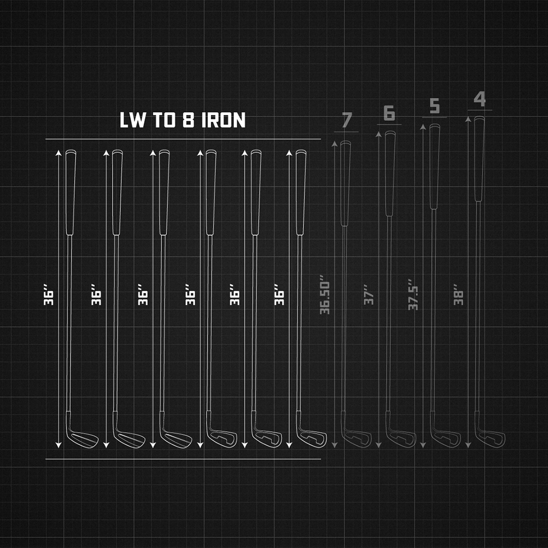 In our combo length sets, the Lob wedge to the 8 iron have a uniform shaft length of 36 inches, roughly equivalent to a 9 iron length. One setup position, greater consistency.